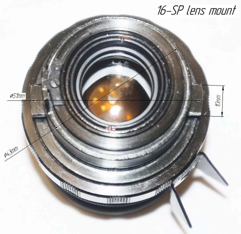 <li>Front side - 16-SP lens mount (compatible with Krasnogorsk-2/Krasnogorsk-3 bayonet lenses)</li>