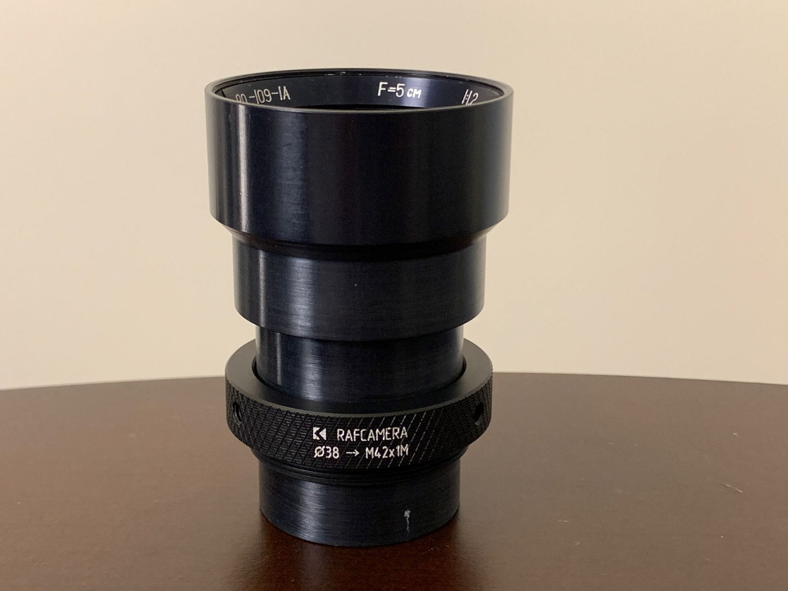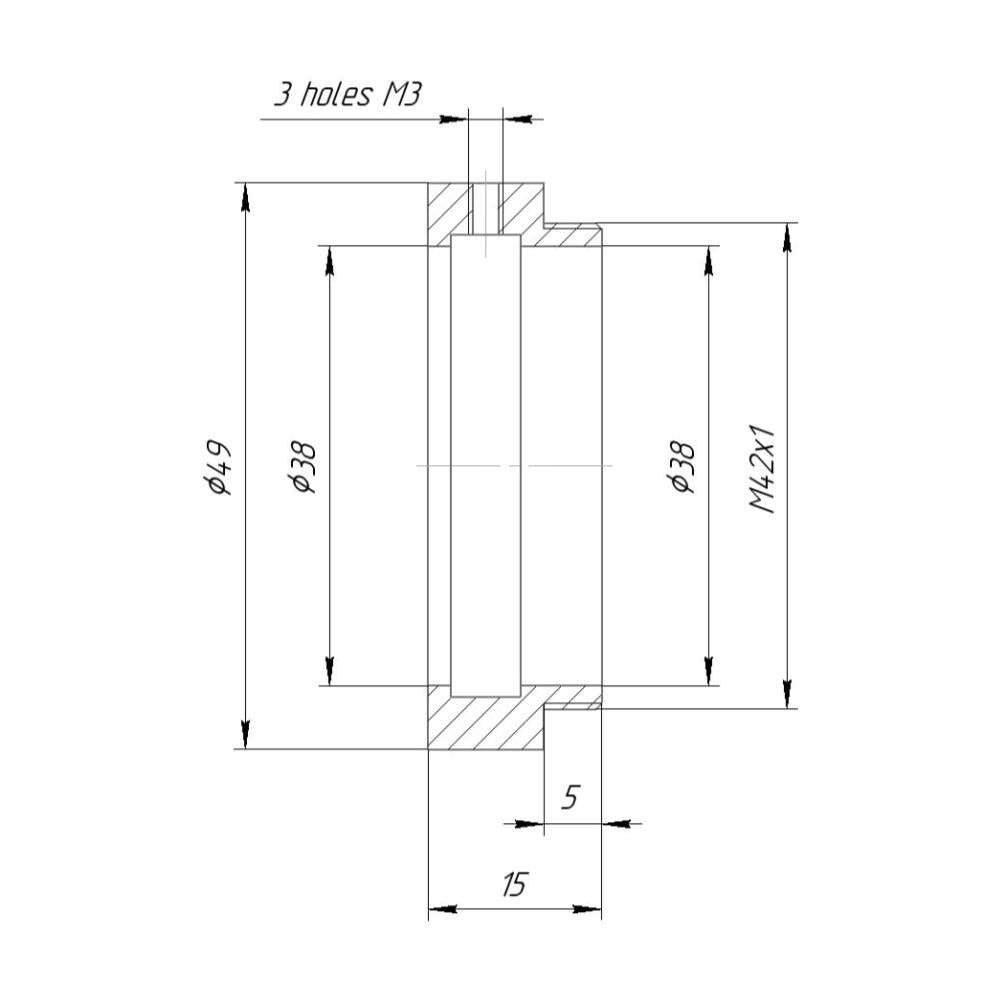 This adapter allows using some projection lenses (like LOMO RO-109) on M42x1 focusing helicoids. These lenses have relatively short back focal distance, so they can reach infinity focus on non-reflex cameras only.