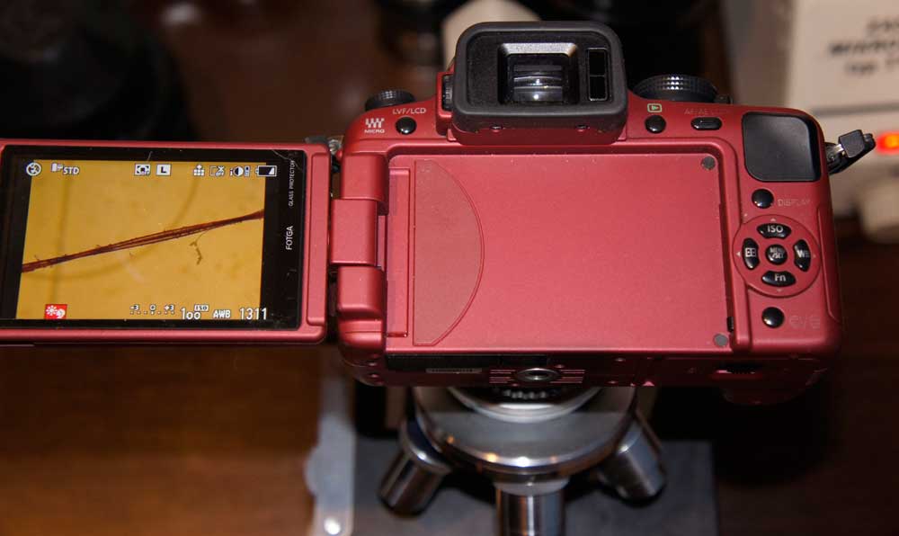 This adapter allows using a camera (film or digital) with a microscope to take hi-res pictures of micro world.