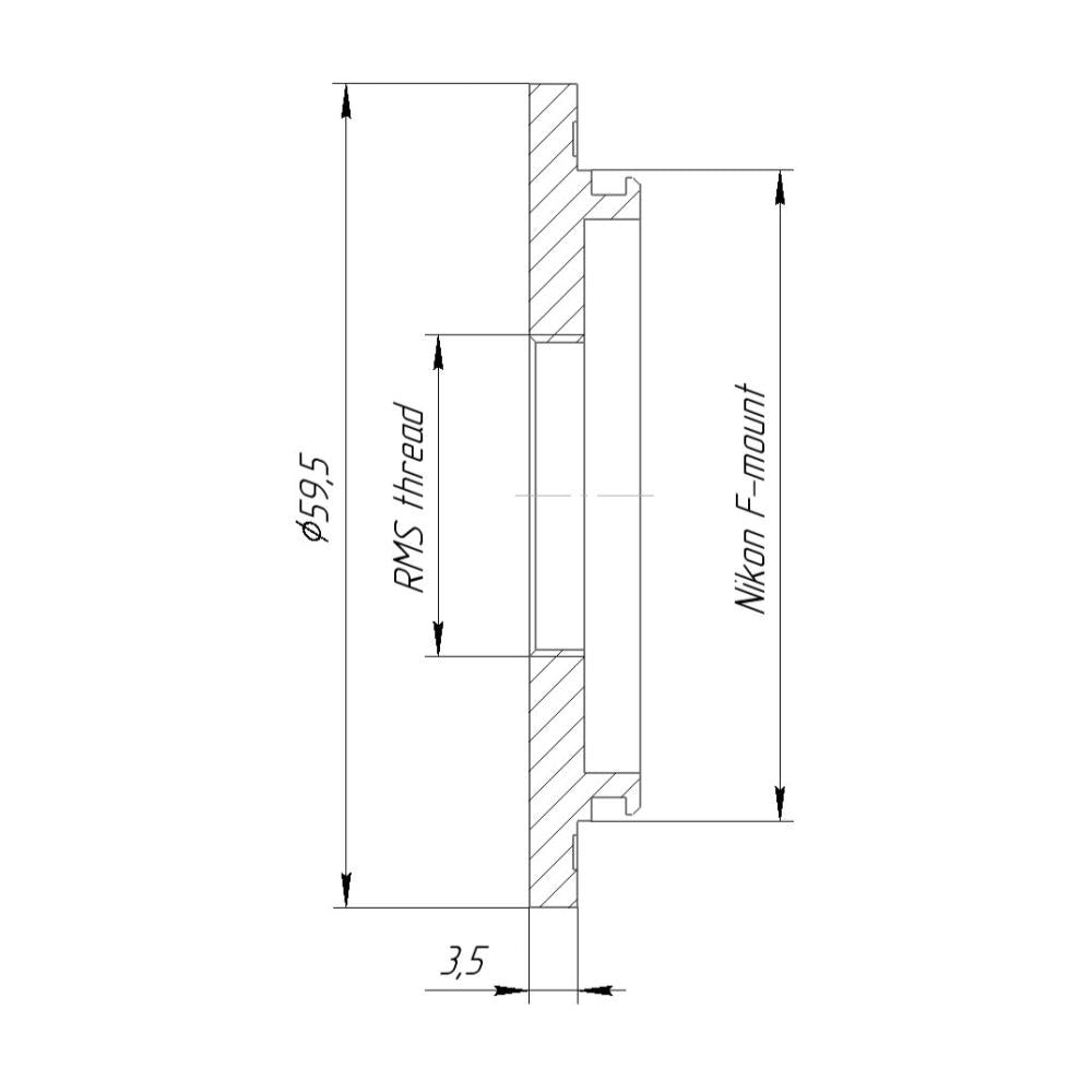 This adapter allows using of RMS microscope objectives (with 0.8″-36tpi mount thread) on Nikon-F cameras or extension tubes/bellows for macrophotography purposes.