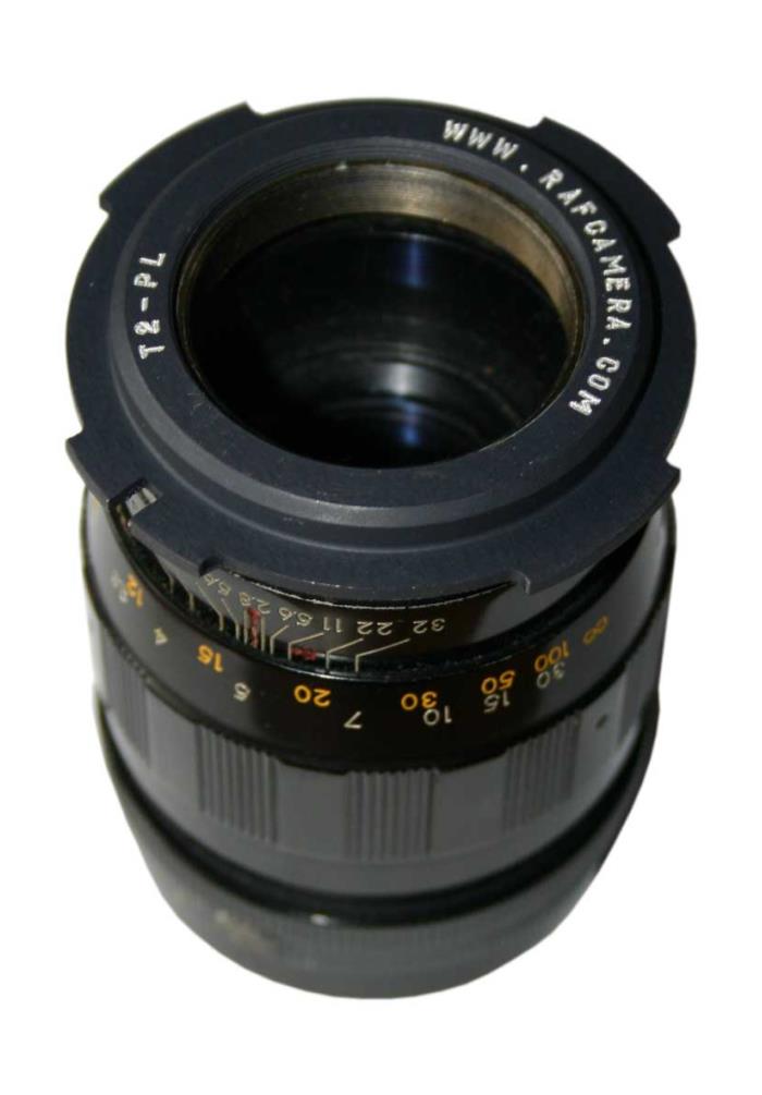 This adapter is made of anodized light alloy (it's weight is only 20gr). It allows to mount T/T2 lenses (m42x0.75, 55mm flange focal distance) onto PL-mounted camera like Arriflex. Also, it can be used with most modern DSLRs through their PL adapters.